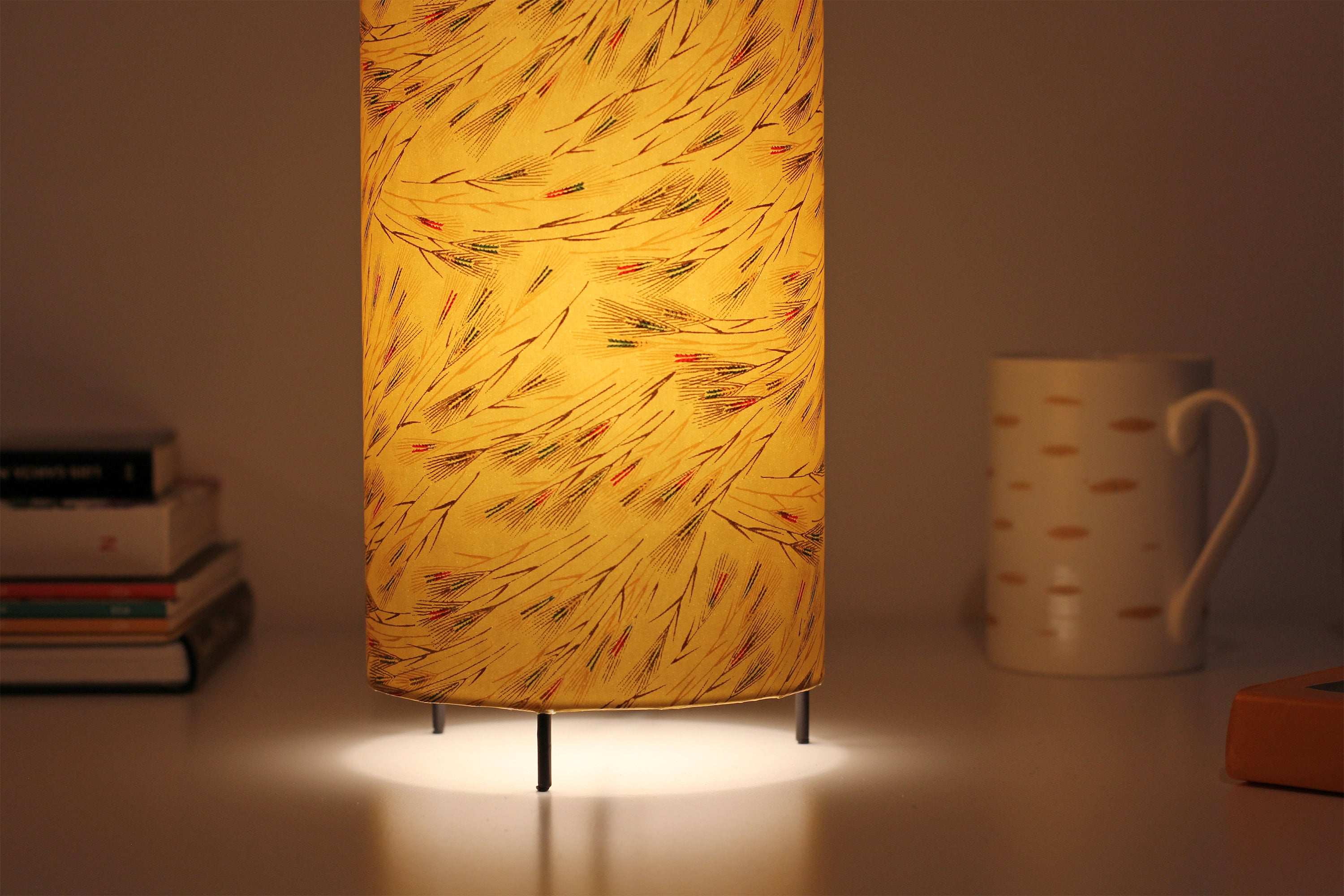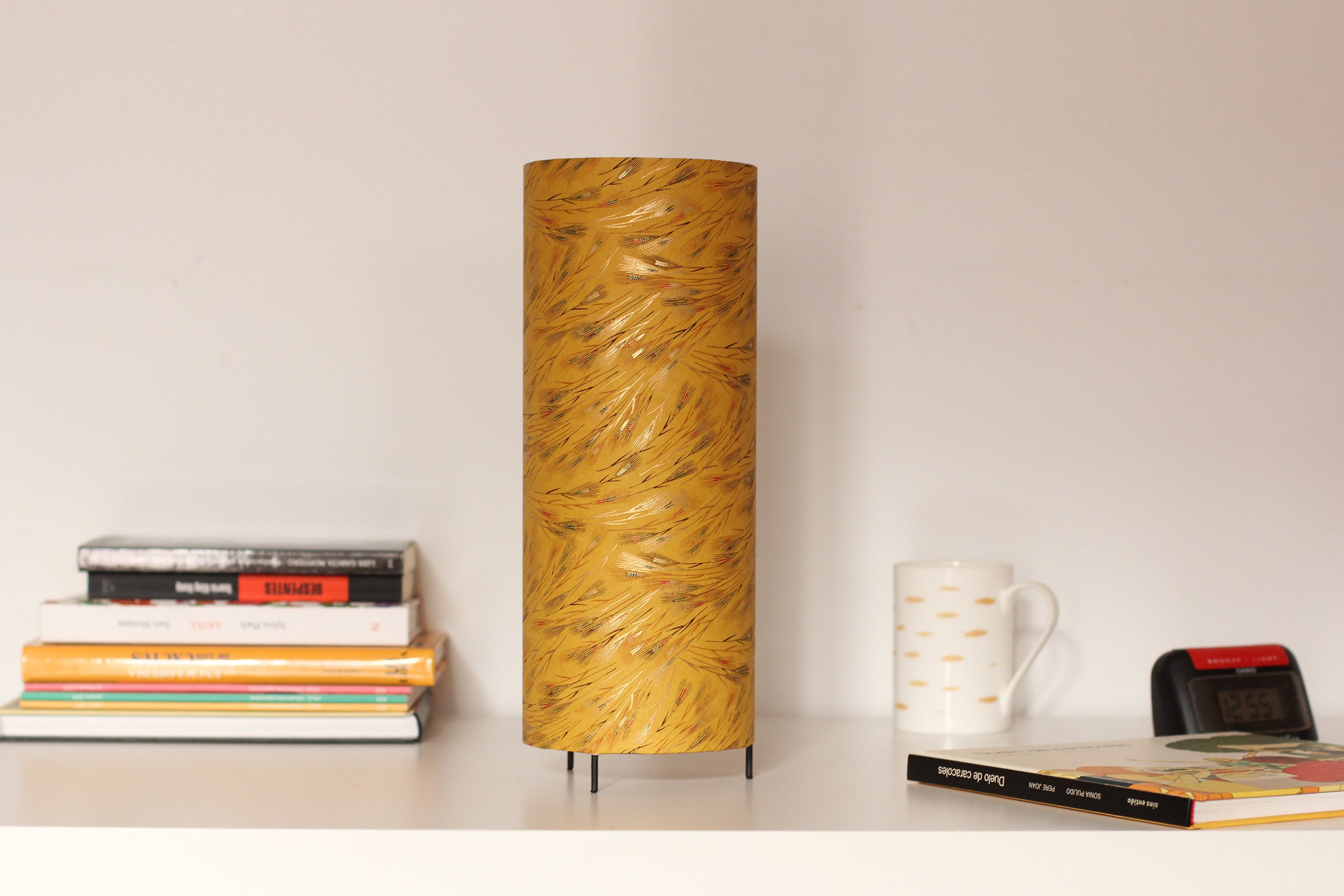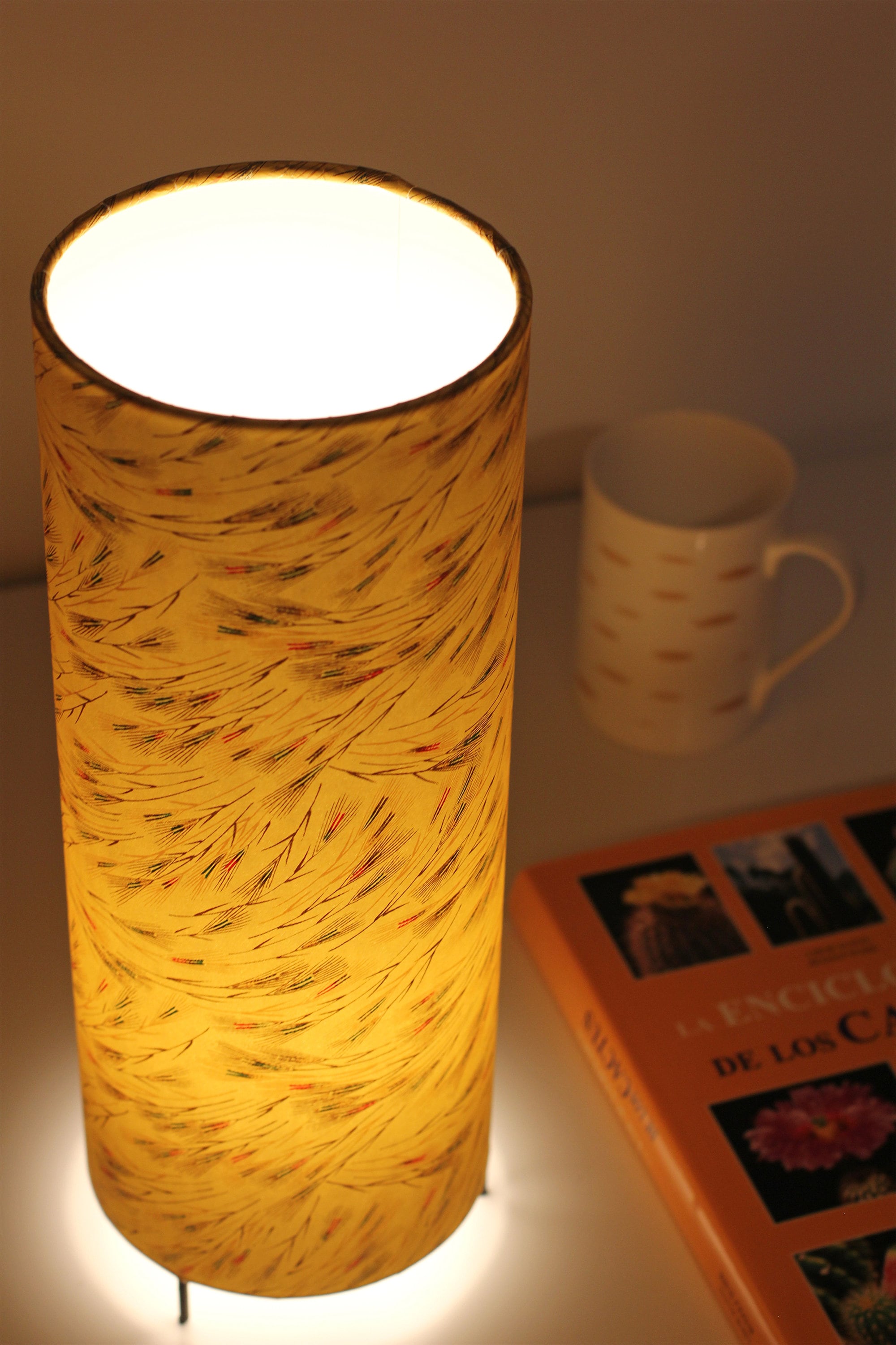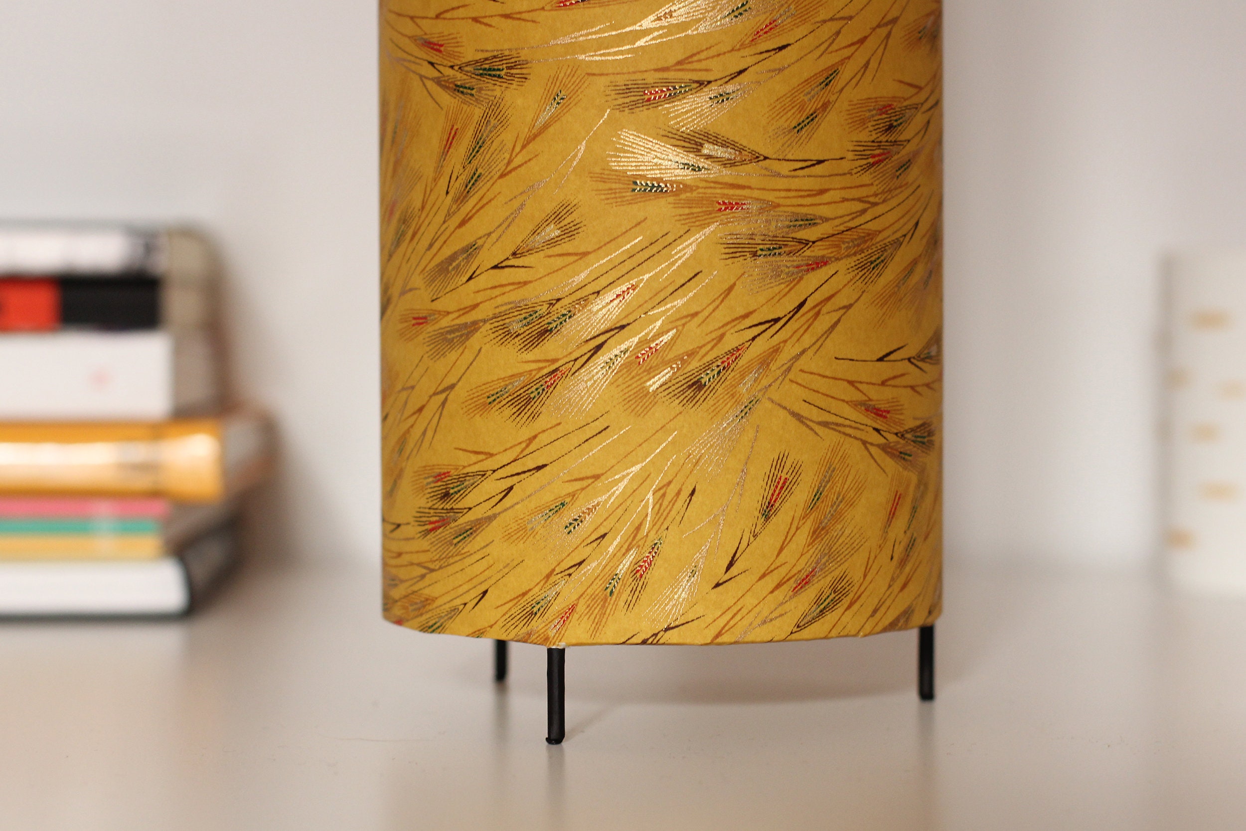 The lampshade is made with a Japanese paper with a pattern of golden ears of wheat over a mustard yellow background. It gives a very nice warm light. This beautiful paper is stuck at the base material of the PVC layer which gives rigidity to it. I mae this lamp in my workshop in Barcelona and keep all the safety regulations required by the European community.
