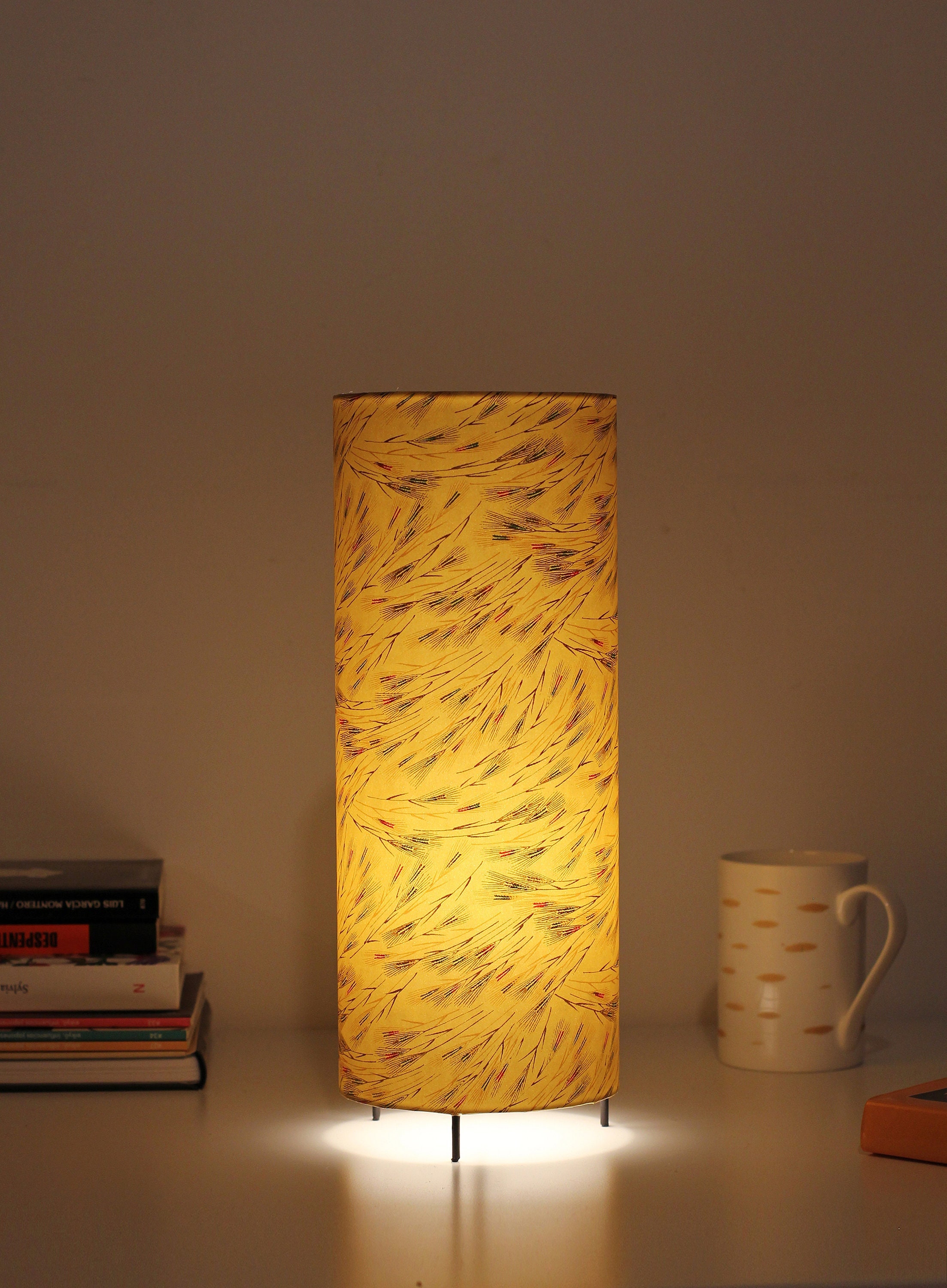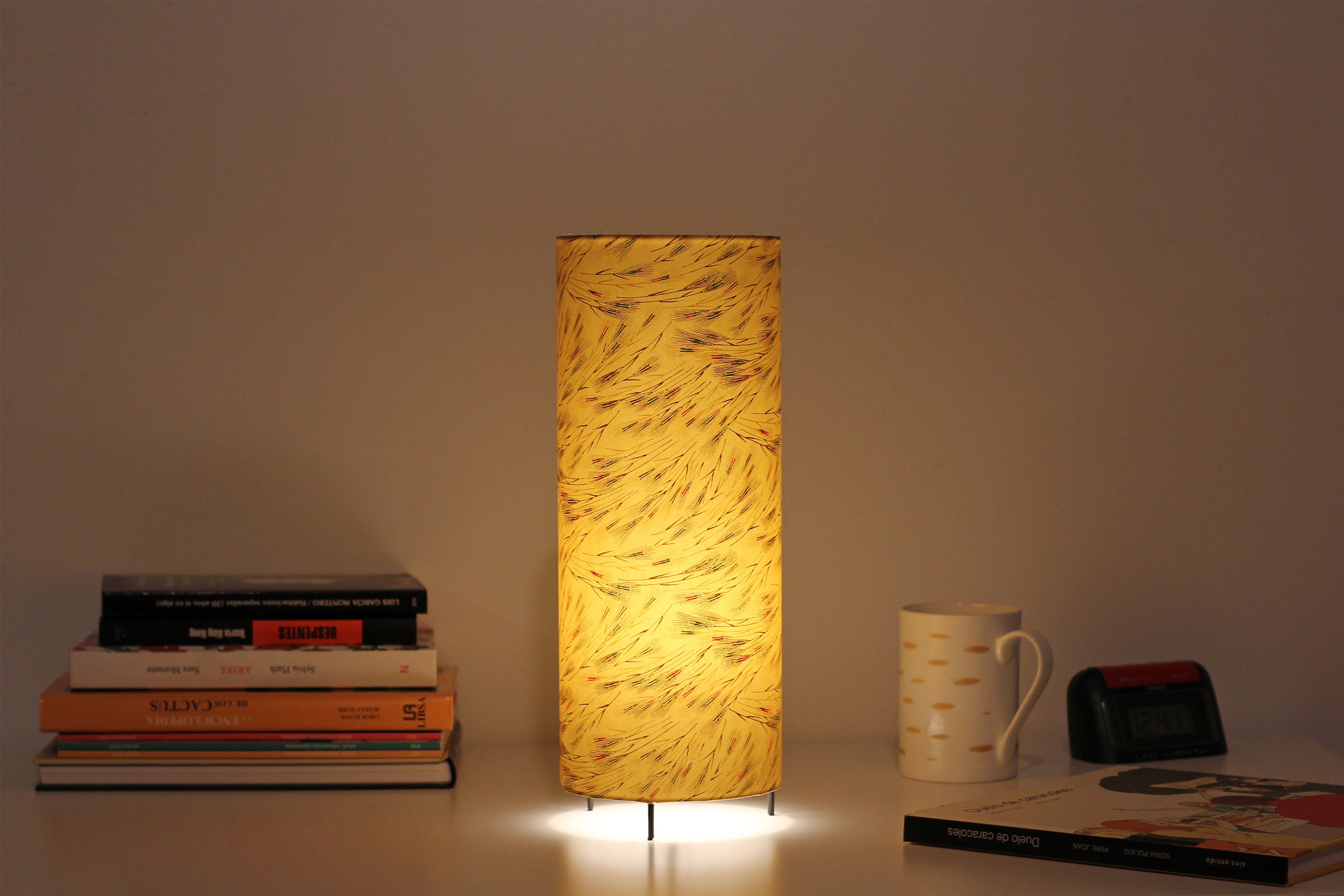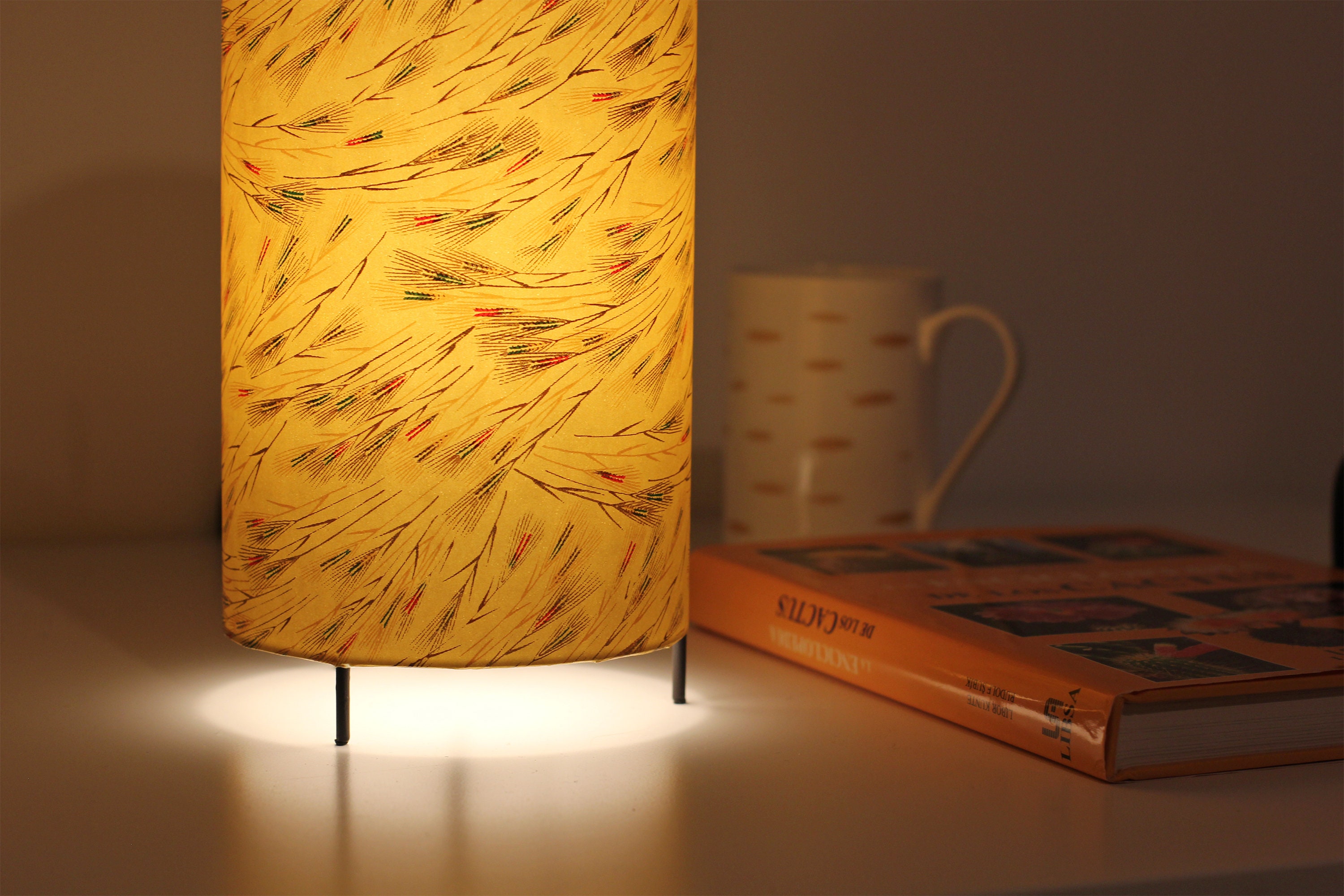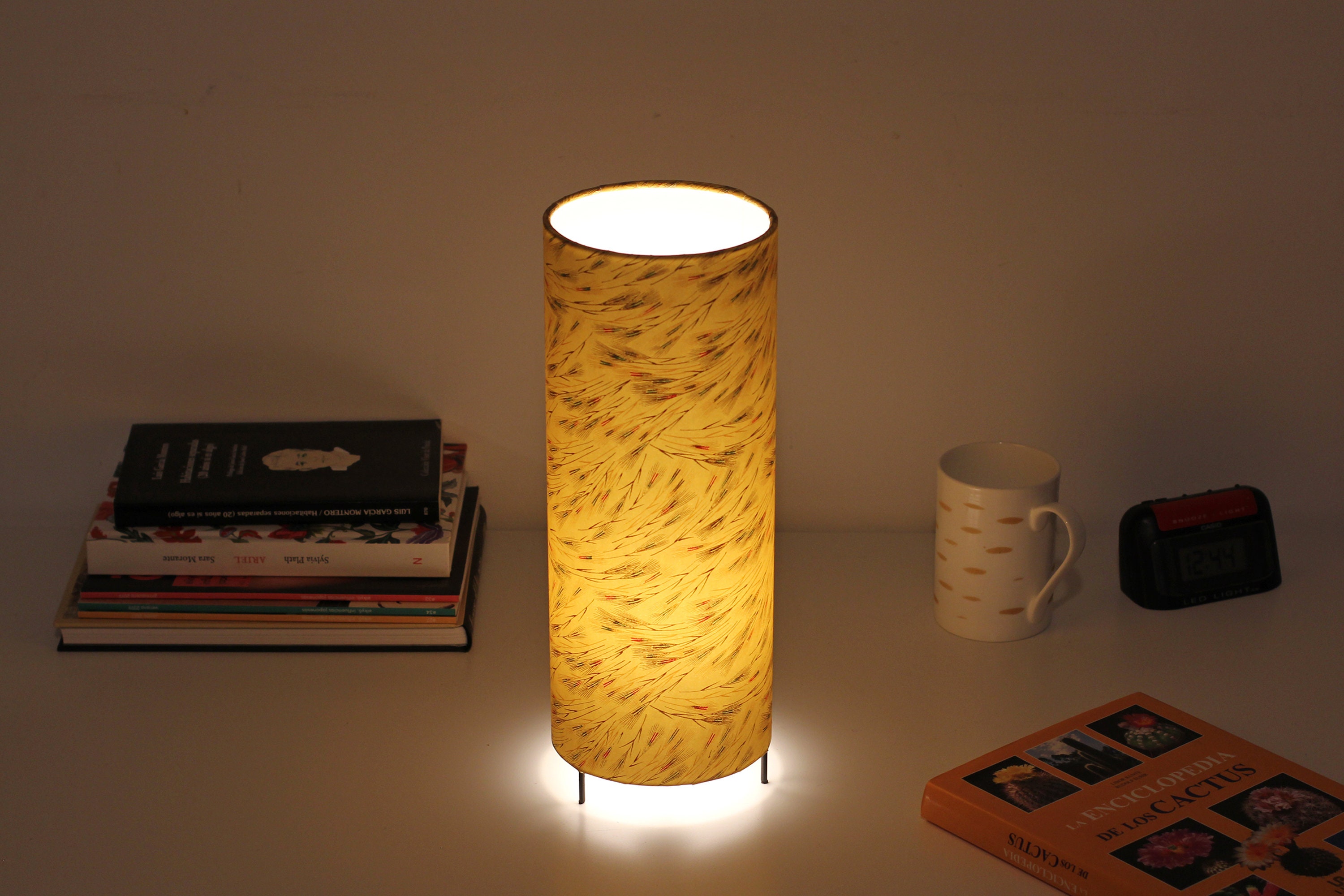 The lampshade is made with a Japanese paper with a pattern of golden ears of wheat over a mustard yellow background. It gives a very nice warm light. This beautiful paper is stuck at the base material of the PVC layer which gives rigidity to it. I mae this lamp in my workshop in Barcelona and keep all the safety regulations required by the European community.